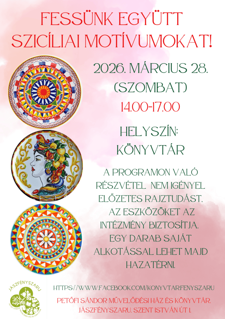 Indul a motívumfestészet, elsőként szicíliai mintákkal. Ha kedvet kaptál hozzá, de még nem voltál, akkor is szeretettel várunk, ha rendszeres foglalkozásra járó vagy, akkor is!A festést 16 éves kortól ajánljuk!