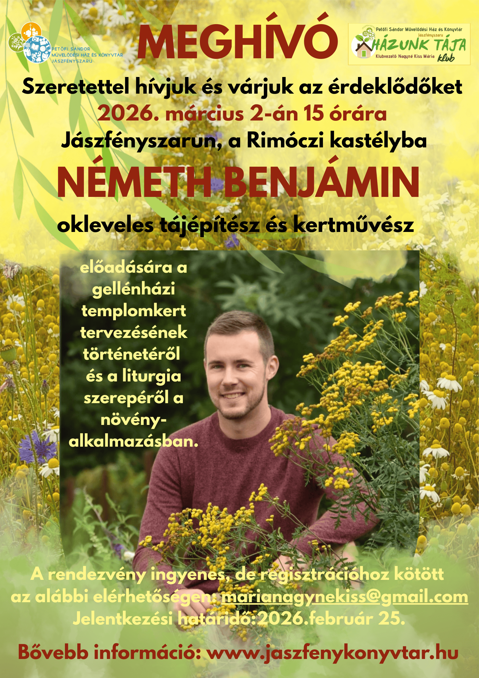 Szeretettel hívjuk és várjuk az érdeklődőket 2026.március 2-án 15 órára Jászfényszarun, a Rimóczi kastélyba Németh Benjámin okleveles tájépítész és kertművész előadására a gellénházi templomkert tervezésének történetéről és a liturgia szerepéről a növényalkalmazásban.