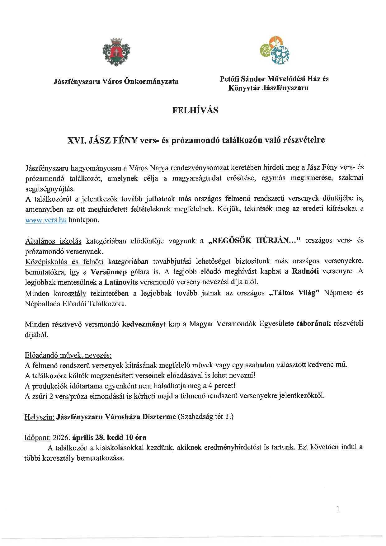 FELHÍVÁS - XVI. JÁSZ FÉNY vers- és prózamondó találkozón való részvételre