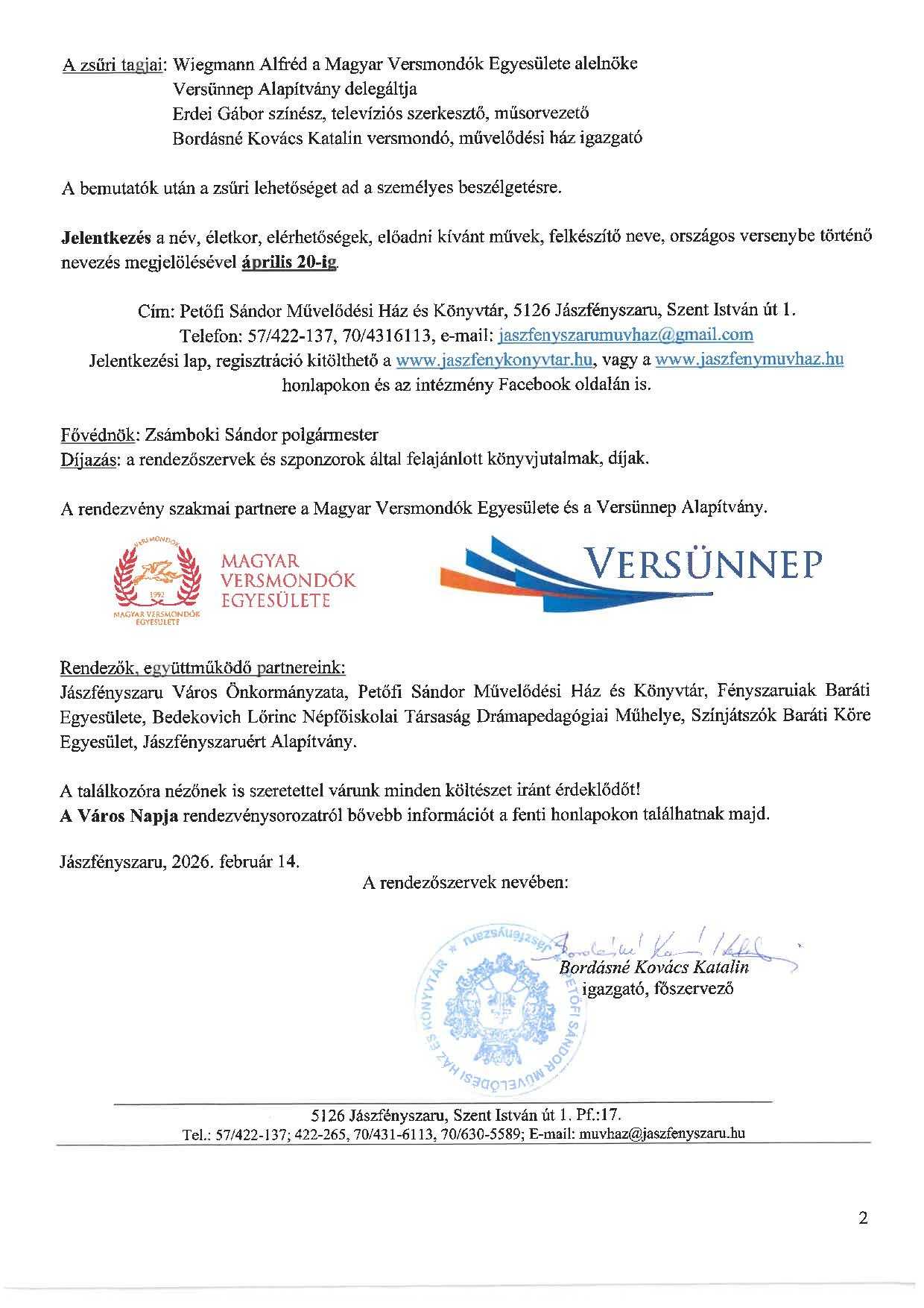 Jászfényszaru, 2026. február 14. A rendezőszervek nevében: