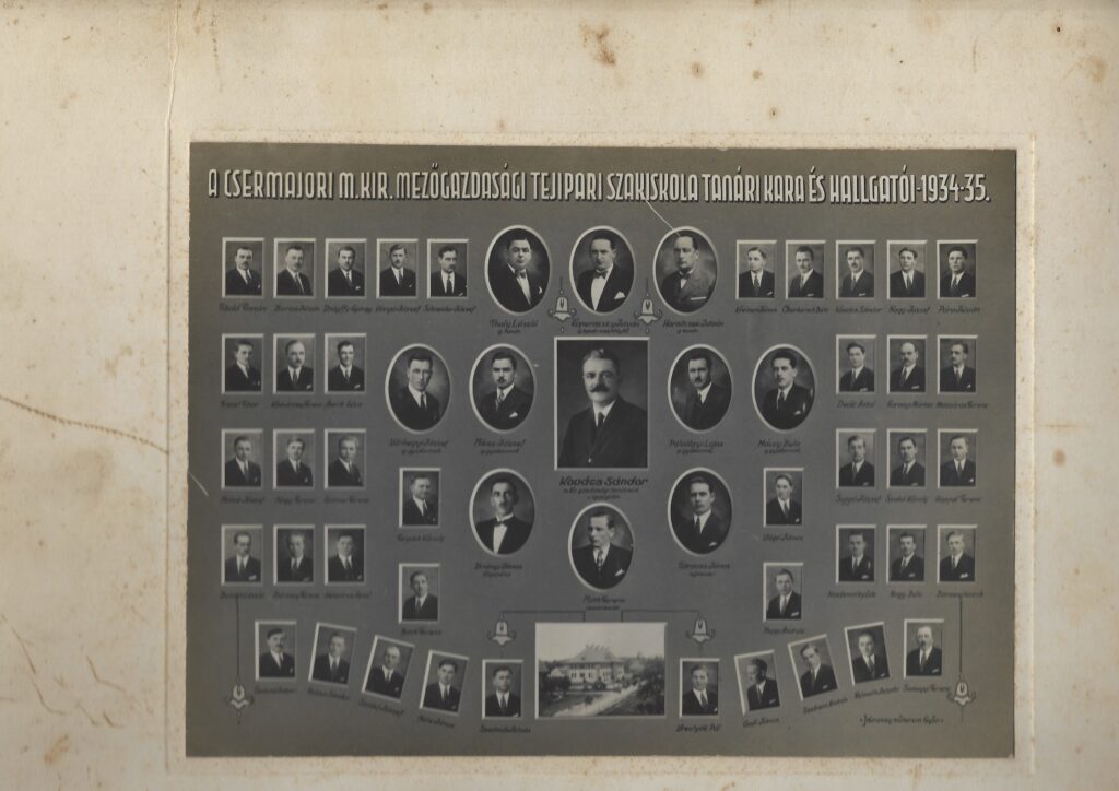 A csermajori Magyar Királyi Mezőgazdasági Tejipari Szakiskola tanári kara és hallgatóinak tablóképe 1935-ből.