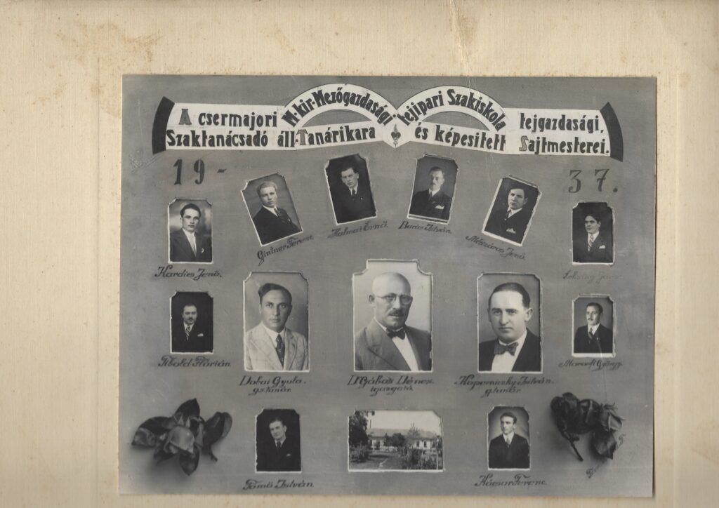 A csermajori Magyar Királyi Mezőgazdasági Tejipari Szakiskola tanári kara és képesített sajtmestereinek tablóképe 1937-ből.