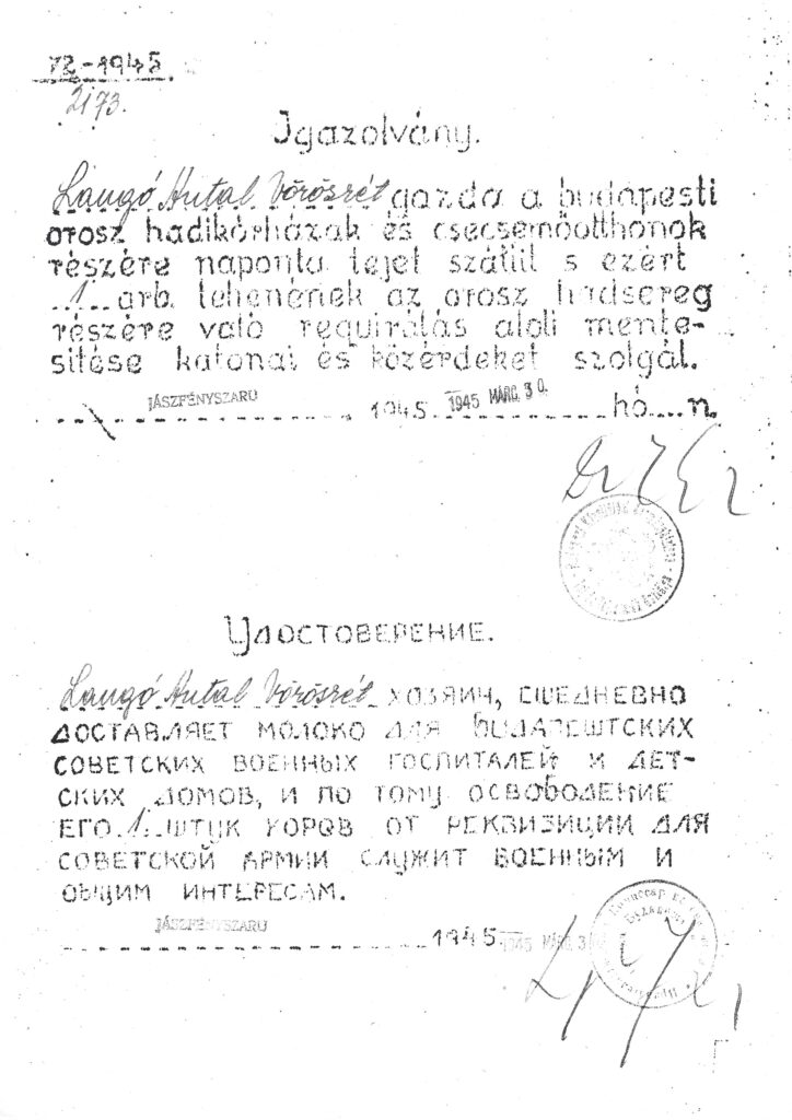 A magyar és orosz nyelvű dokumentum Langó Antal veresréti gazda részére került kiadásra 1945 márciusában.