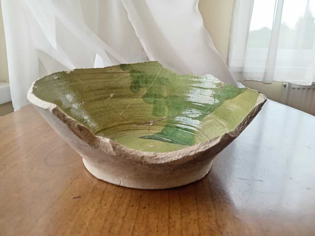 Szele Flóriánék által 1891-ben kidobott zöld mázas kerámia tál töredéke az összeállítás után.